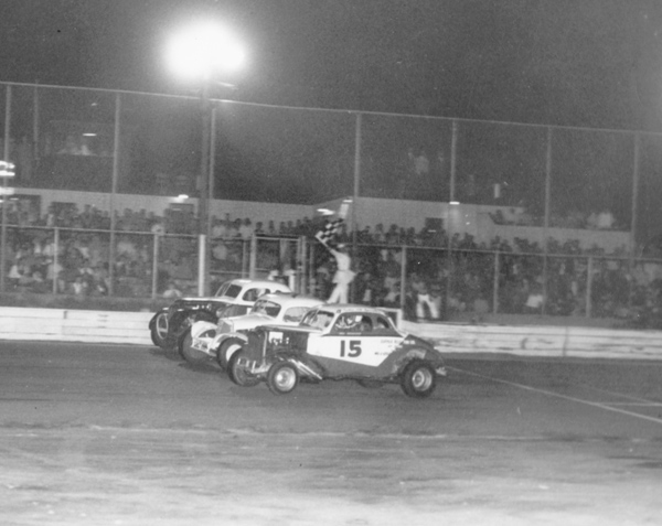 Ernie Gahan (15) beats Bill Slater (white V8) and Red Foote (J2) to the finish line on September 5,1960.