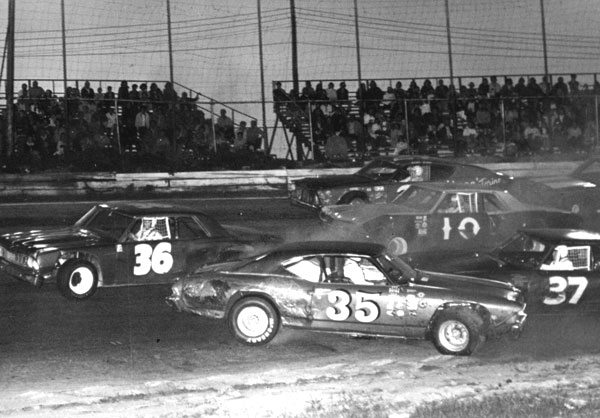 | Track Photographer Bill Balser captures Armando Vieira's 35 car as he spins in traffic in turn two. Bill Goodrow (36) made it past Vieira as did Ron Larkin (10) and Dave Dion (27). George Delmar (37) was trapped low and got a piece of the 35 car. Delmar and Vieira were able to continue with only minor damage. Photo by: Bill & Dave Balser - 1972 Courtesy of the Bill Goodrow Collection |